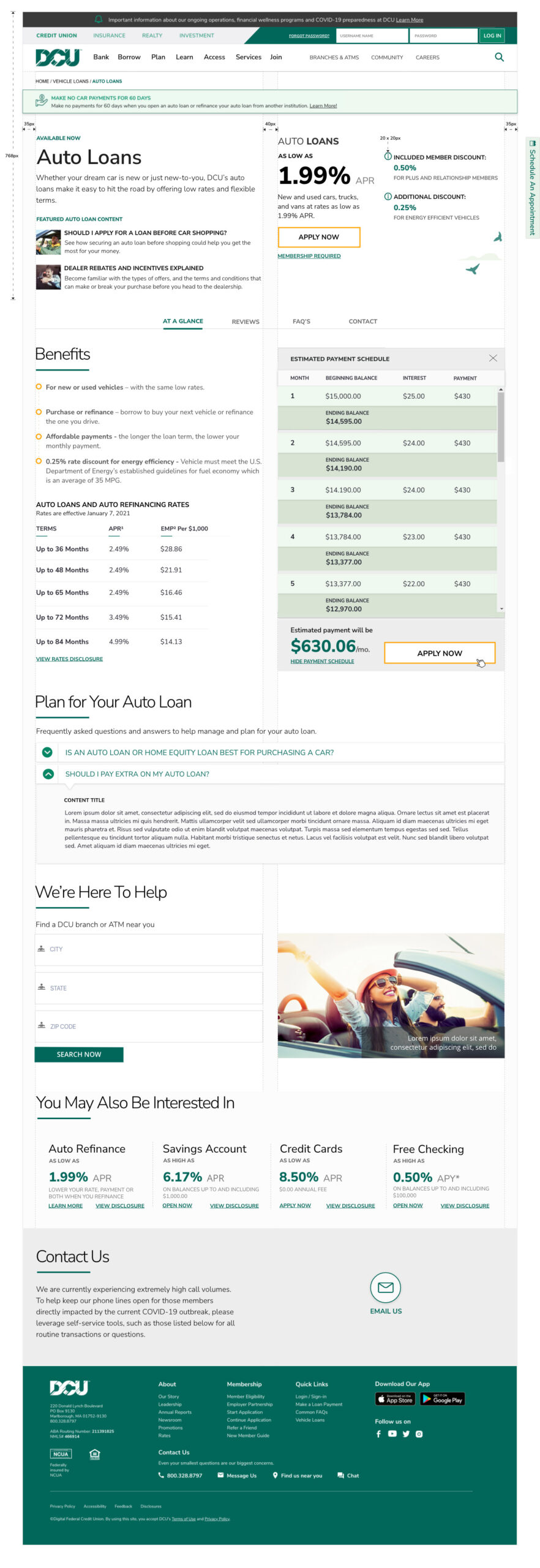 April 22, 2026DCU came to us with a familiar credit-union challenge: a product page that asked too much of the visitor. Rates lived in one place, calculators in another, comparison content further down, and the application button was a long scroll away from the point where most members had already made up their mind. The page was thorough but diffuse — a menu, not a tool. Our charge was to compress the auto-loan decision into a single, confident view.