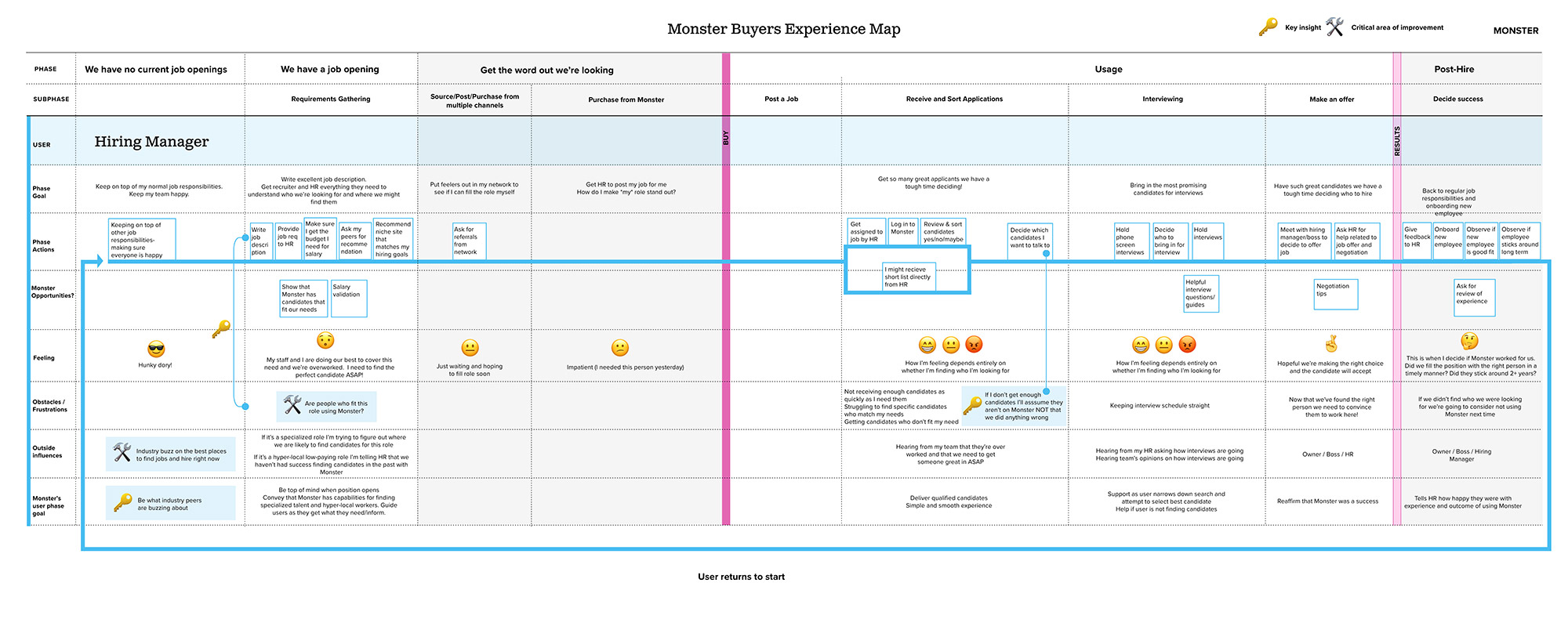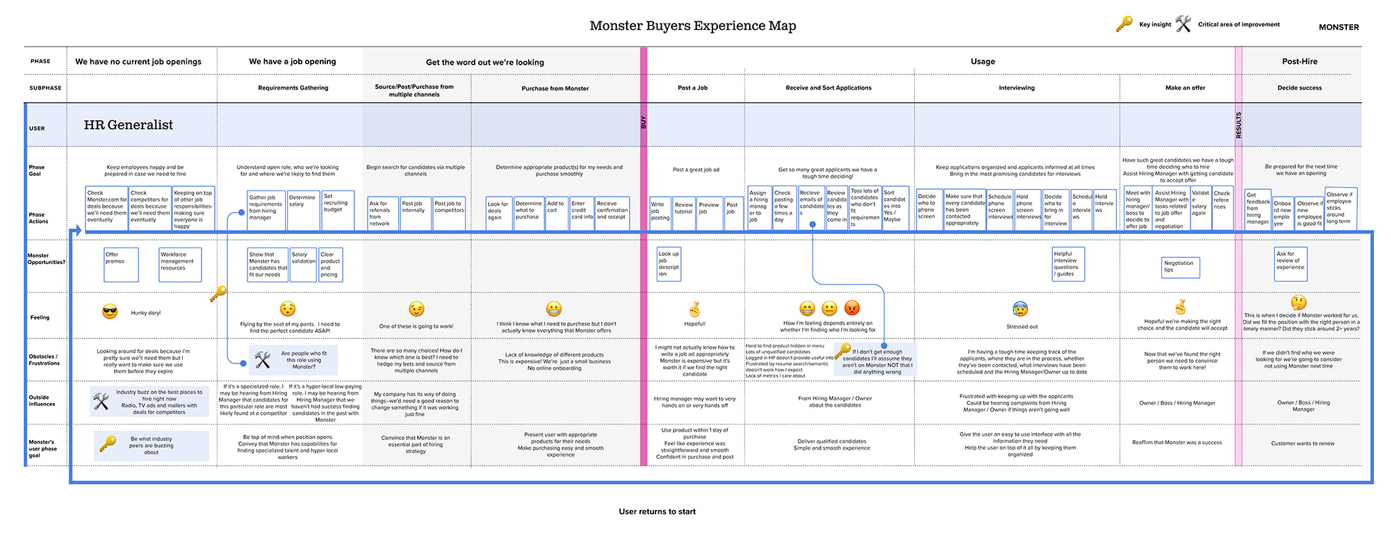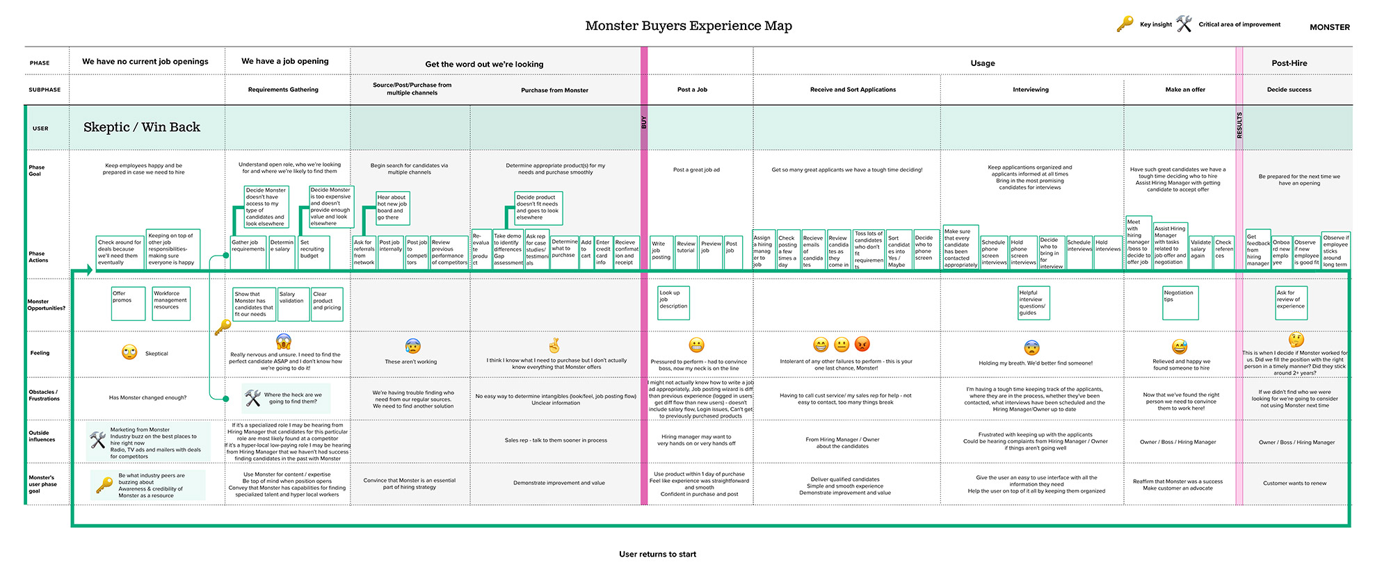 Before we could write a single persona, we needed to understand the full arc of an employer’s journey with Monster. We ran discovery workshops, conducted contextual interviews with over 40 hiring stakeholders, and synthesized findings into a Monster Buyers Experience Map — a comprehensive artifact that maps the employer’s path from “We have no current job openings” all the way through Post-Hire success evaluation.