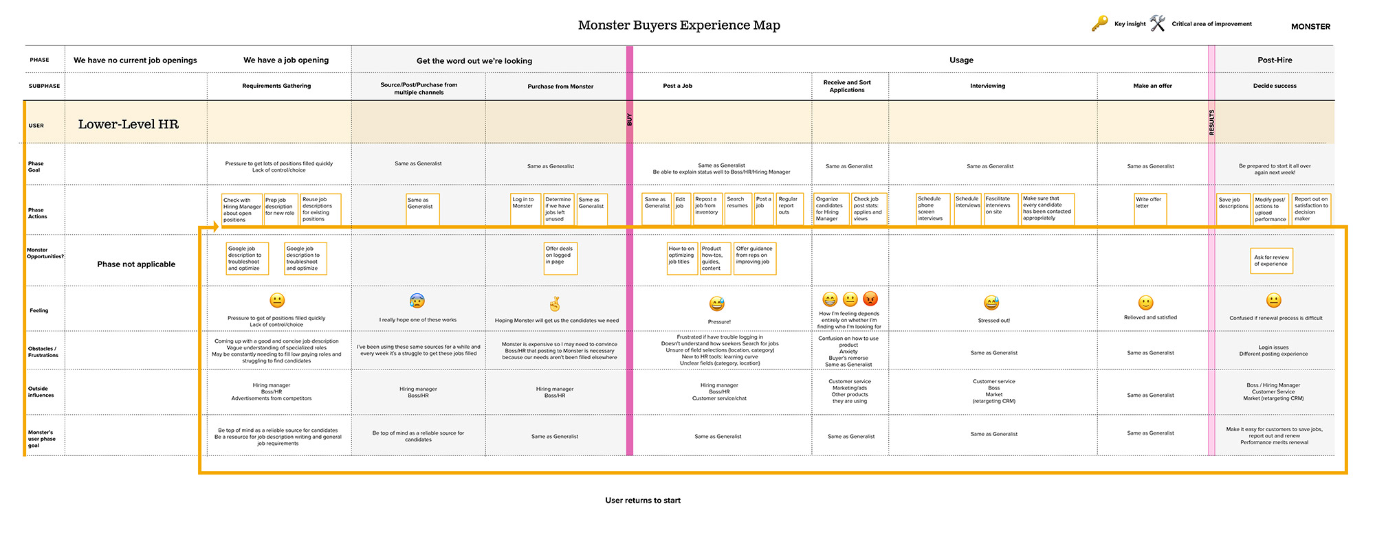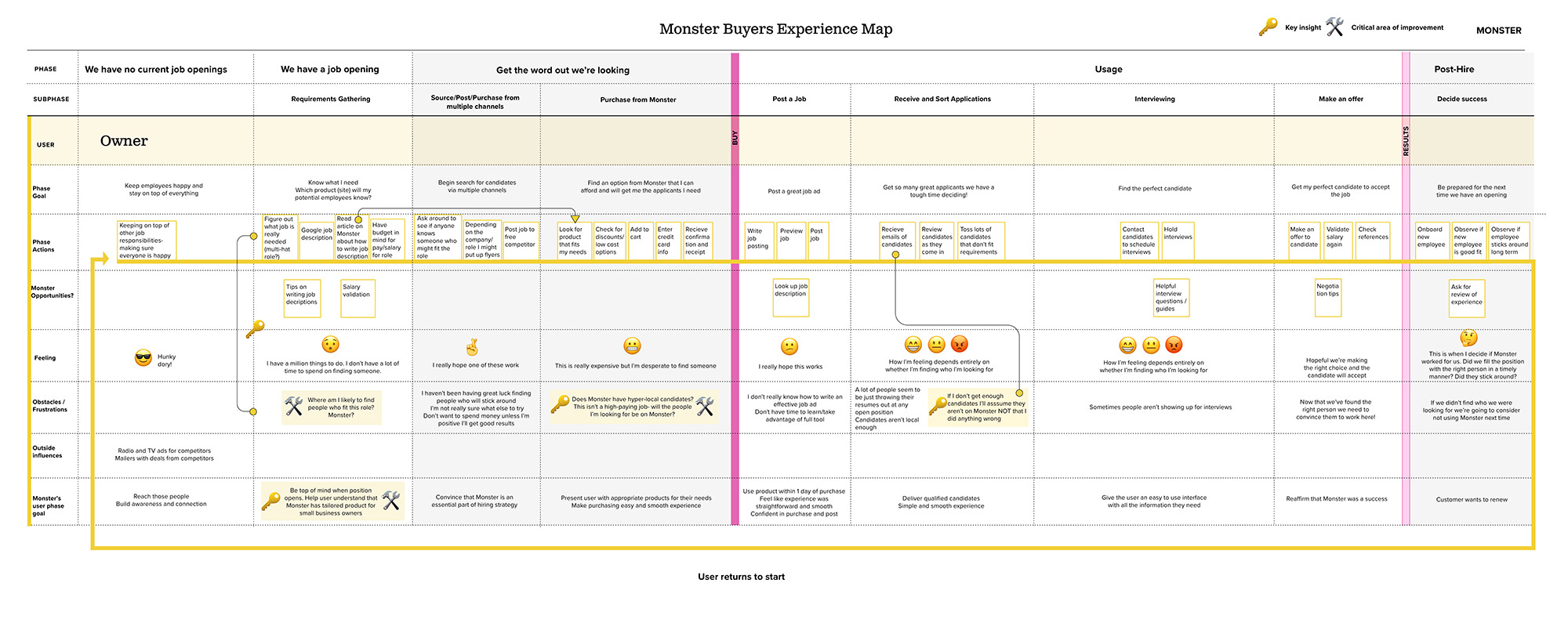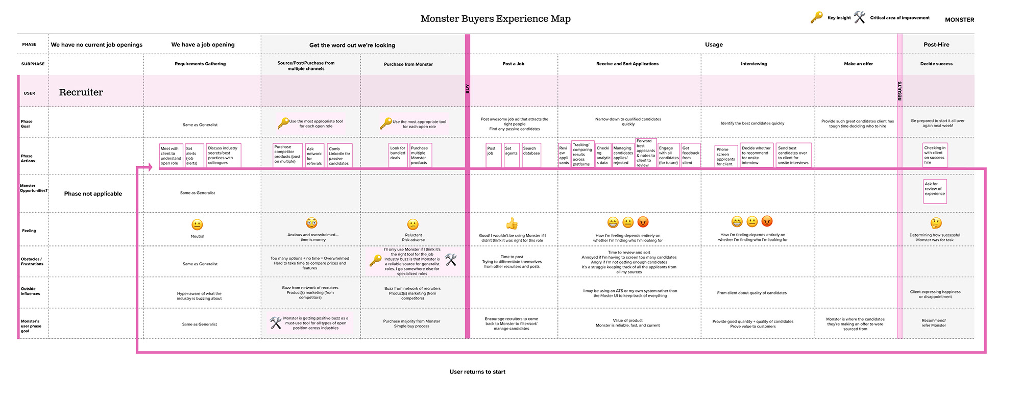 Before we could write a single persona, we needed to understand the full arc of an employer’s journey with Monster. We ran discovery workshops, conducted contextual interviews with over 40 hiring stakeholders, and synthesized findings into a Monster Buyers Experience Map — a comprehensive artifact that maps the employer’s path from “We have no current job openings” all the way through Post-Hire success evaluation.