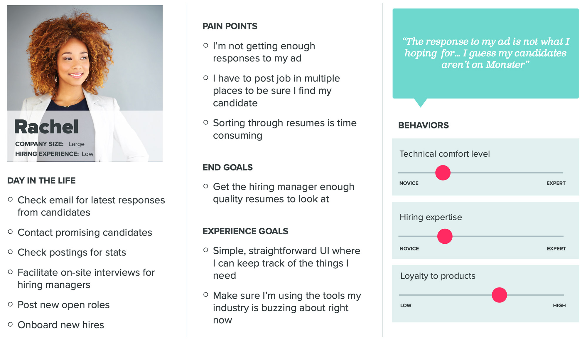Key insight: Onboarding and in-context help are critical for this persona. She represents a large share of Monster’s day-to-day users, especially in SMB accounts. Any friction in the job posting flow — unclear product options, confusing pricing, lack of preview capability — translates directly into drop-off or support volume.